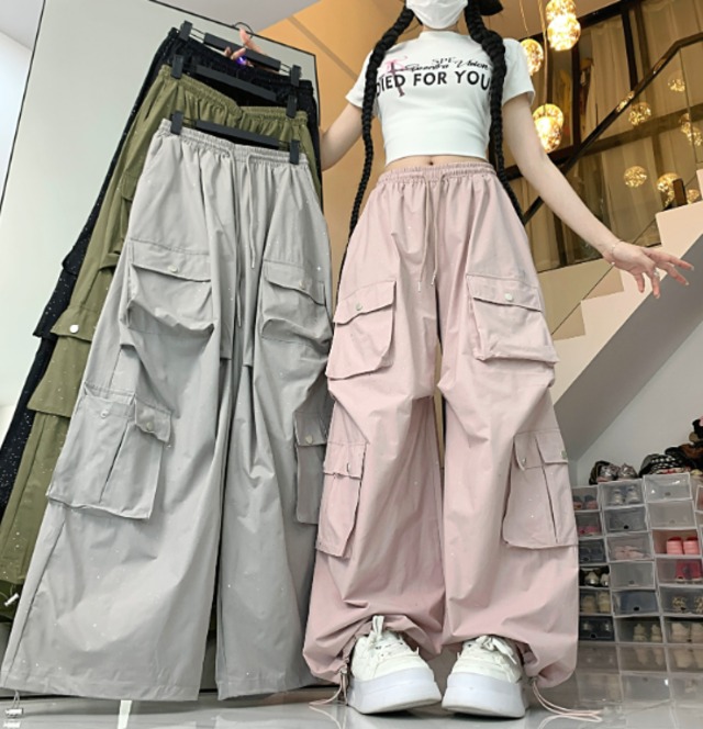 カーゴパンツ パンツ ズボン ボトムス ロング ワイド 太い 太め 大きいサイズ ビッグ ゆったり ハイウエスト ゴム ポケット ダンス 衣装 ヒップホップ HIPHOP レディース ガールズ 個性的 奇抜 かっこいい 韓国ファッション 練習着