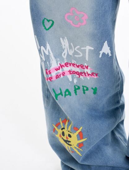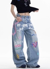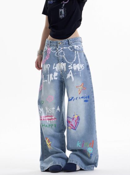 プリント ハート柄とチェーン柄が特徴のジーンズは、個性的でスタイリッシュなボトムスです!ユニセックスデザインで、レディース・ガールズ・メンズ問わず楽しめるこのアイテムは、ストリートスタイルやヒップホップダンスにも最適です。太めのワイドシルエットが動きやすさを提供し、リラックス感あふれる着用感を実現しています。ポケット付きなので、スマホや小物を収納できて、機能性もばっちり。おしゃれ感と可愛らしさを兼ね備えた韓国ファッションの一部として、ぜひあなたのコーディネートに取り入れてみてください!