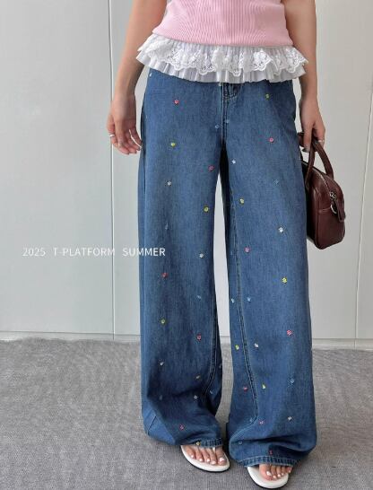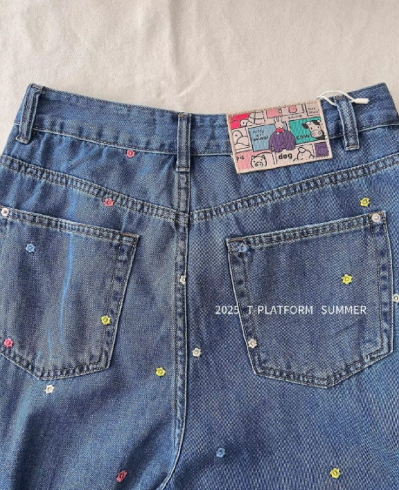 刺繍 ジーンズ ジーパン パンツ ズボン ボトムス 太い 太め ワイド デニム レディース ガールズ ストリート 大きいサイズ かわいい 個性的 韓国ファッション
