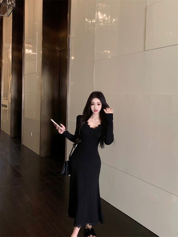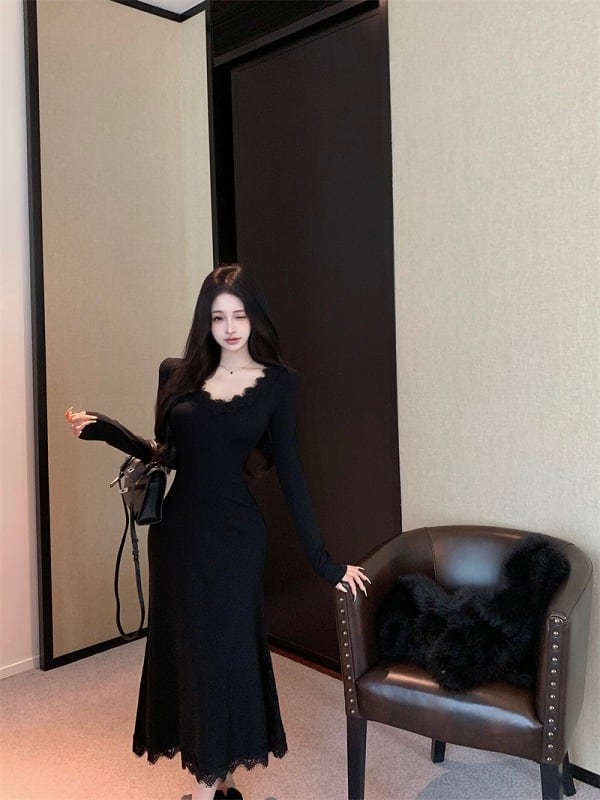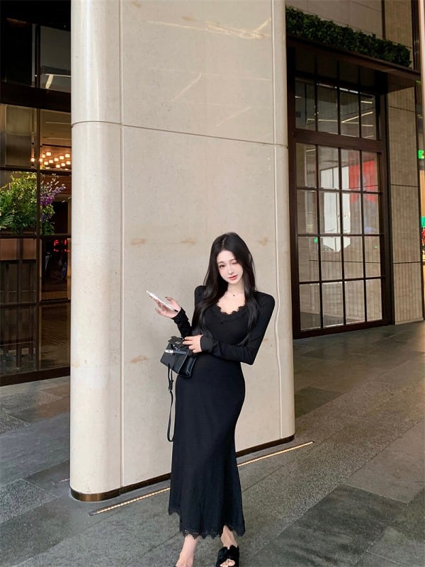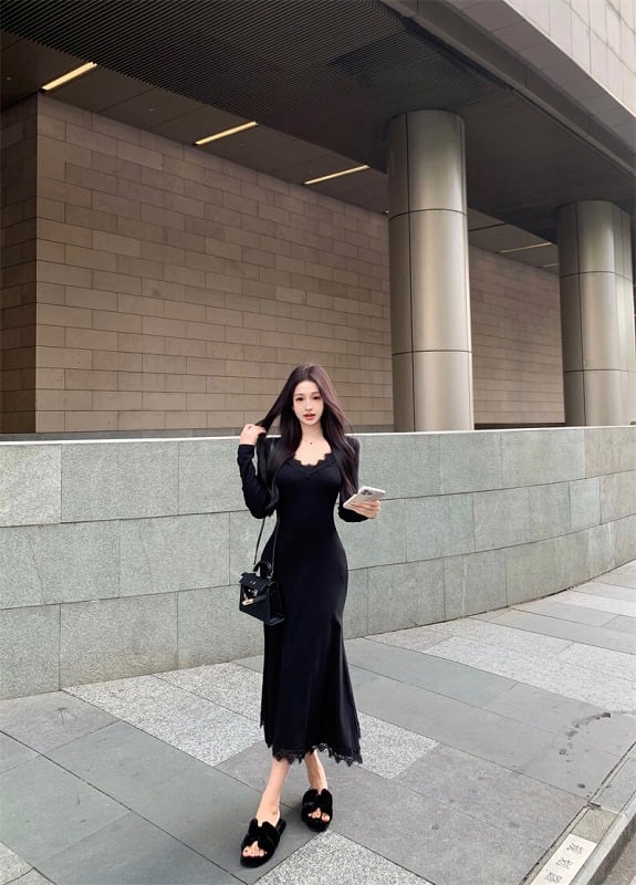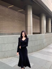 ■特徴:シンプルなデザインの長袖ワンピースで、タイトスカート部分にはフリルが施されており、上品な印象を与えます。切り替えデザインが特徴的で、スリムなシルエットを実現。着痩せ効果もあり、どんな場面でも活躍するアイテムです!