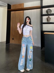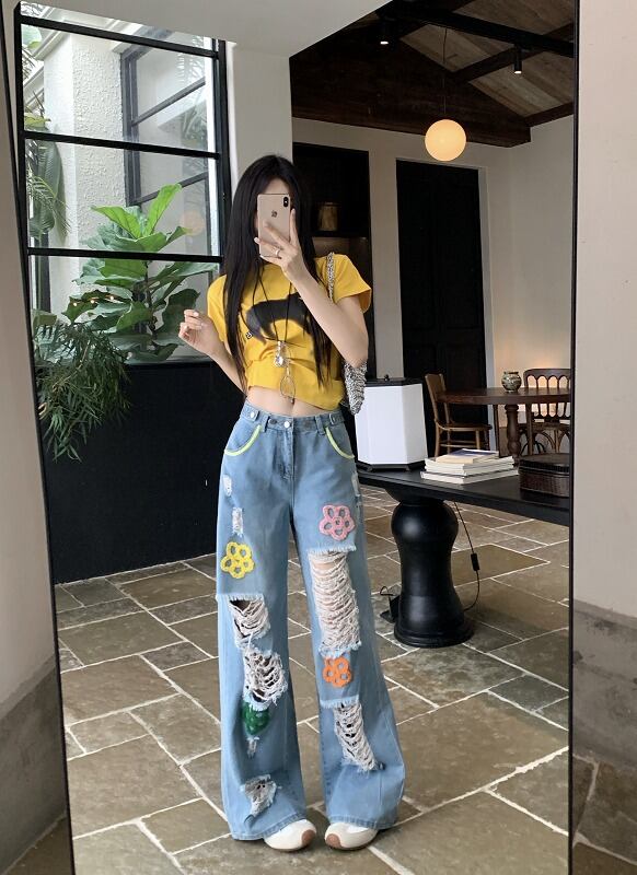 Gパン ジーパン ジーンズ ダメージ加工 切り替え 体型カバー 着痩せ デニム カジュアル