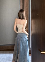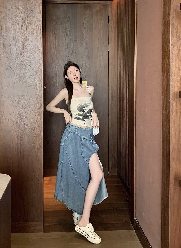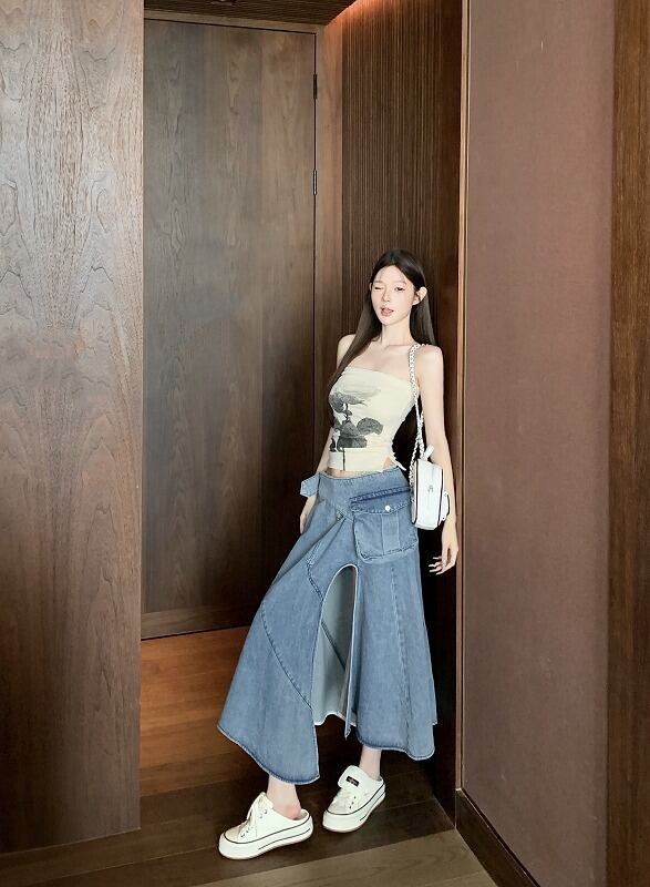 デニムスカート アシンメトリー スリット フリル スリム 着痩せ デニム シンプル