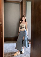 デニムスカート アシンメトリー スリット フリル スリム 着痩せ デニム シンプル