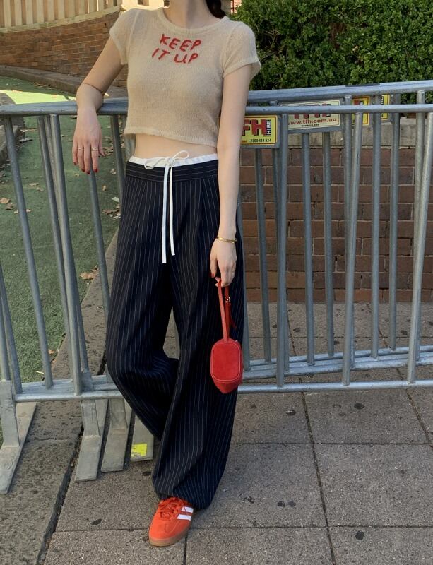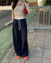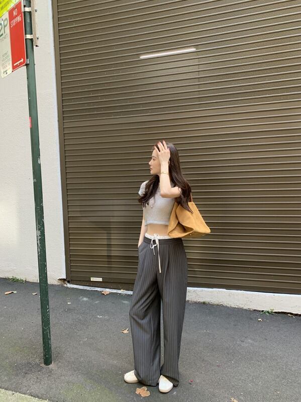 全2色 ワイド バギーパンツ 切り替え バイカラー 体型カバー 着痩せ ストライプ柄 カジュアル