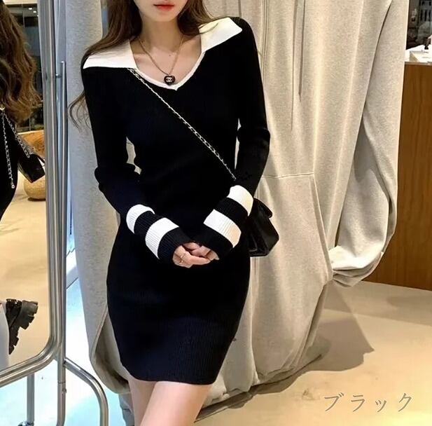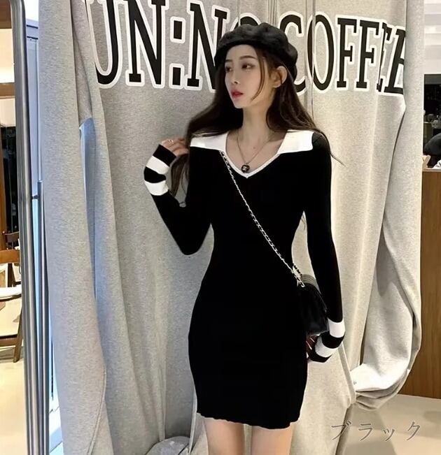 全2色 タイトワンピース 切り替え バイカラー スリム 着痩せ カットソー シンプル