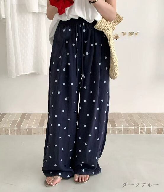 全2色 ワイド バギーパンツ 切り替え バイカラー 体型カバー 着痩せ ドット柄 カジュアル