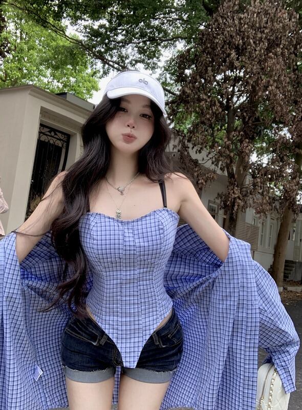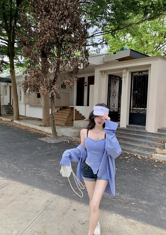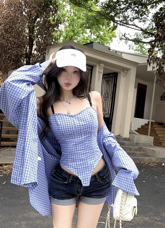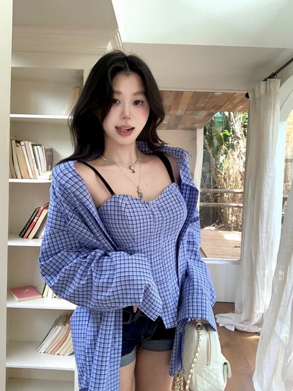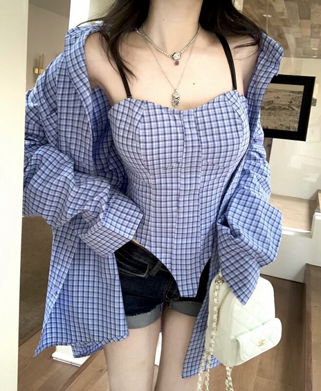 長袖シャツ 2点セット 切り替え バイカラー 体型カバー 着痩せ チェック柄 シンプル