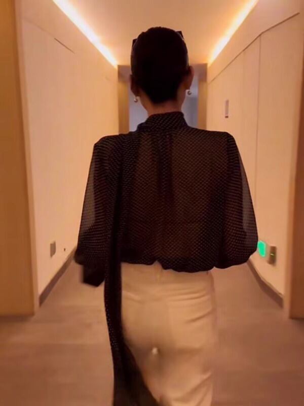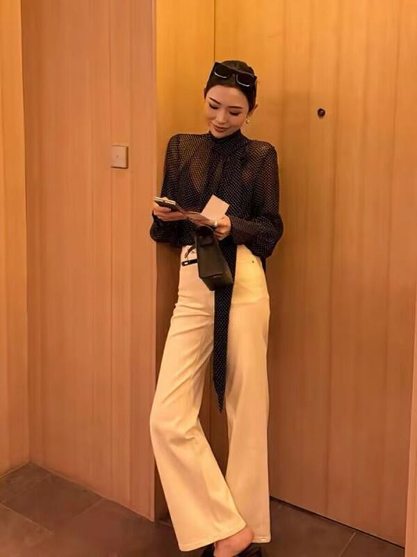 長袖シャツ 切り替え バイカラー 体型カバー 着痩せ ドット柄 カジュアル