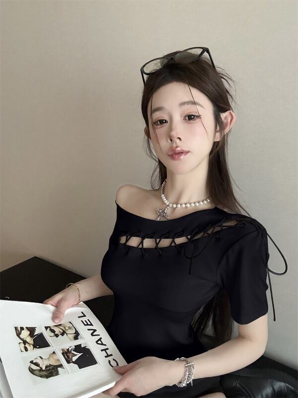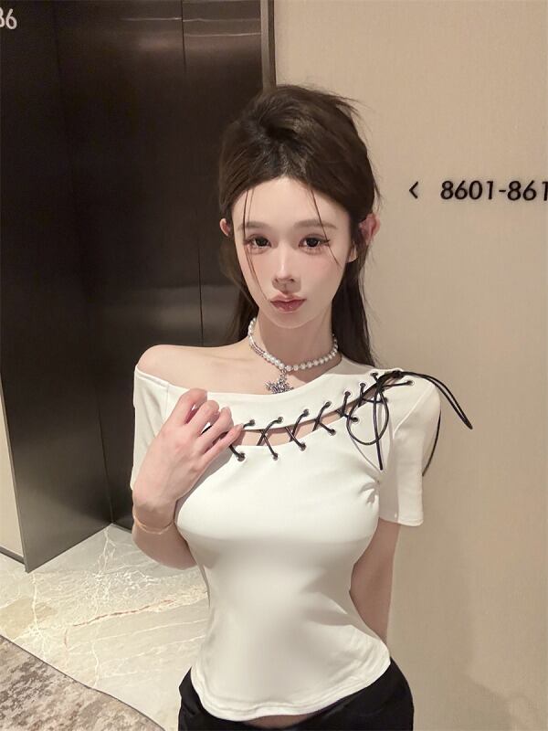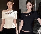 全2色 トップス アシンメトリー ショット丈 切り替え スリム 着痩せ シンプル