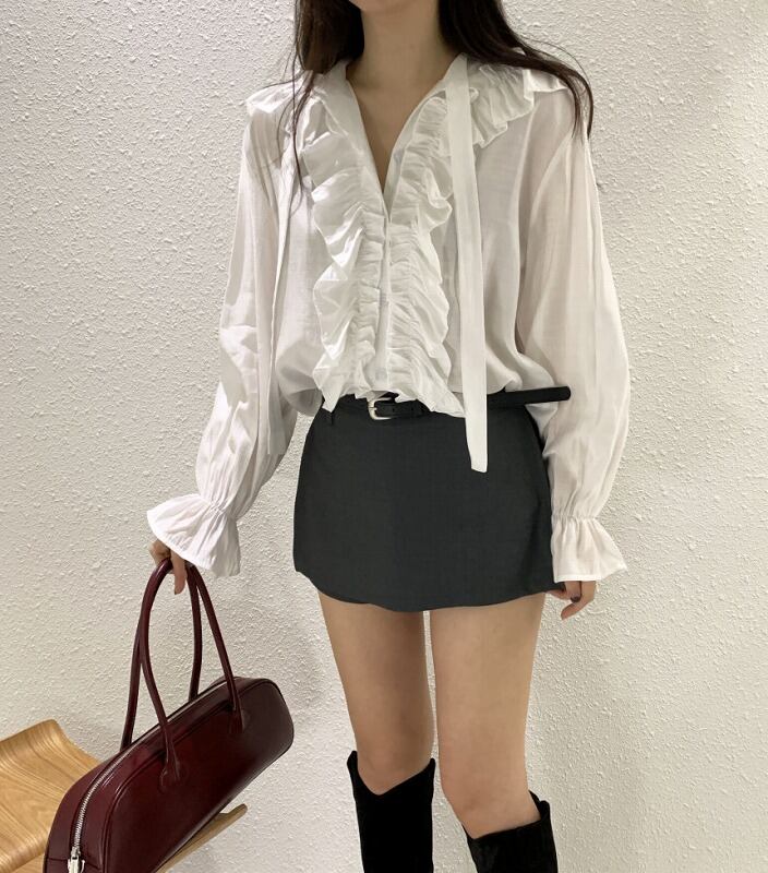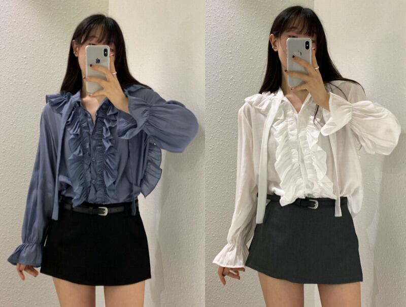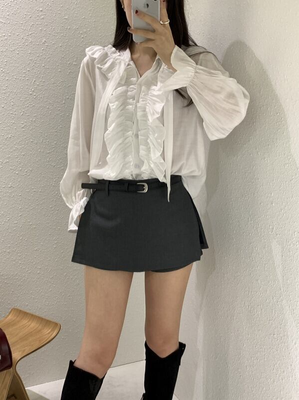 全2色 長袖シャツ フリル 切り替え 体型カバー 着痩せ sweet系