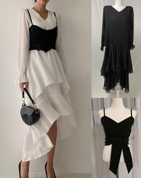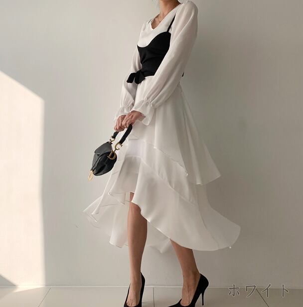 全2色 チュニックワンピース 2点セット フリル 切り替え スリム 着痩せ カジュアル