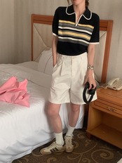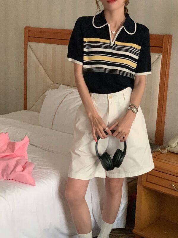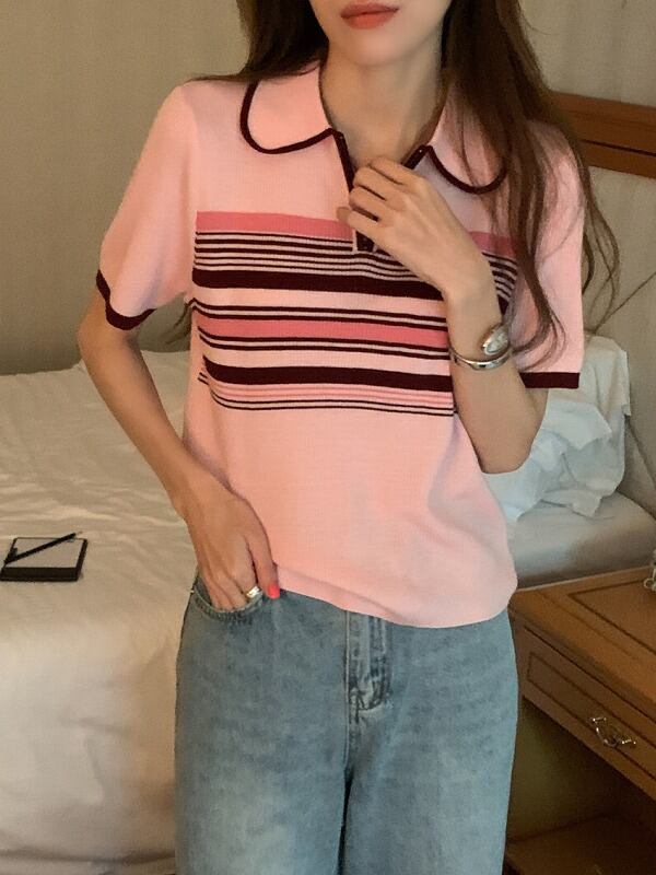 全2色 半袖トップス 切り替え バイカラー 体型カバー 着痩せ カットソー ボーダー柄 カジュアル
