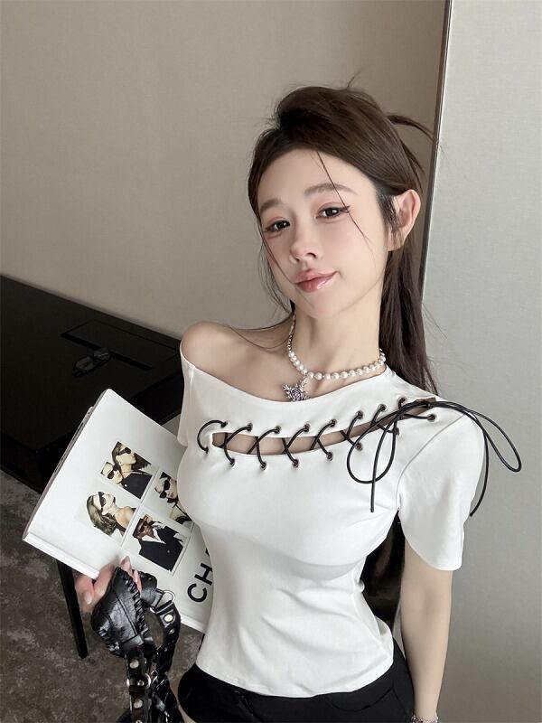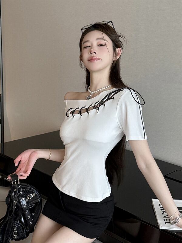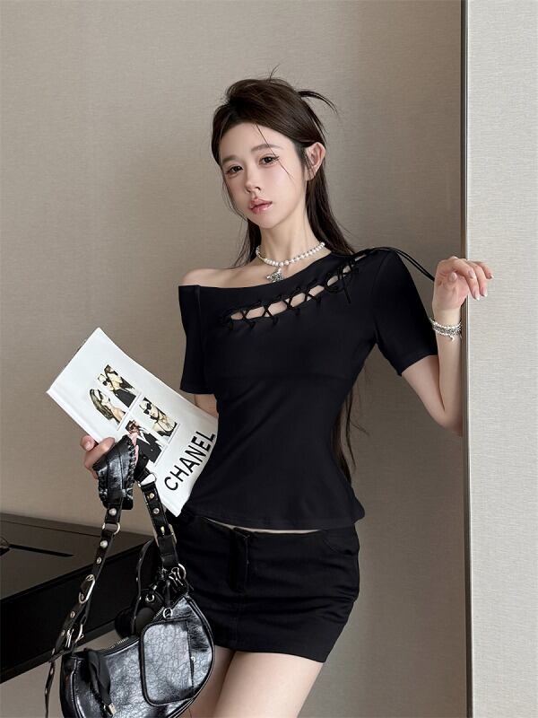 全2色 トップス アシンメトリー ショット丈 切り替え スリム 着痩せ シンプル