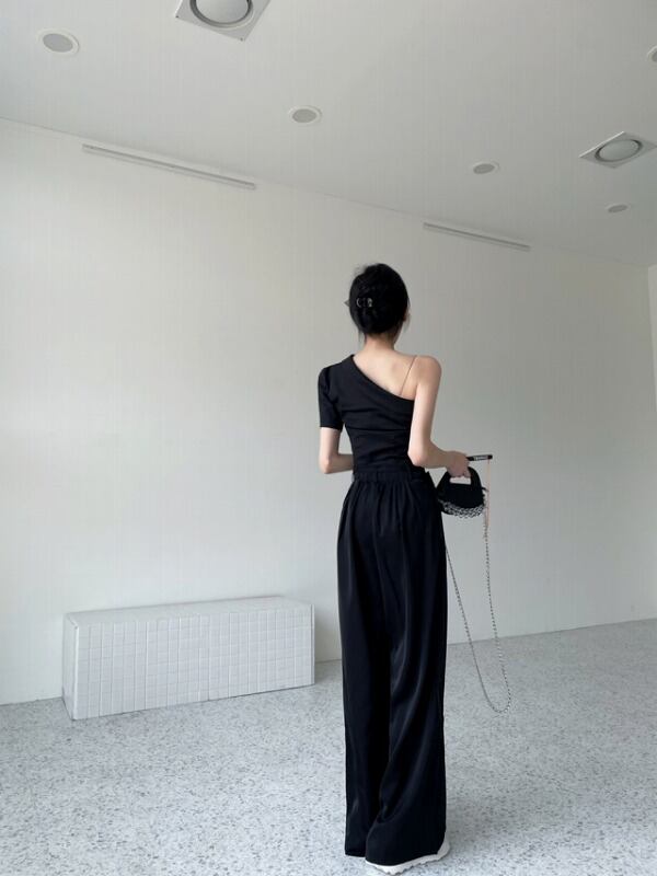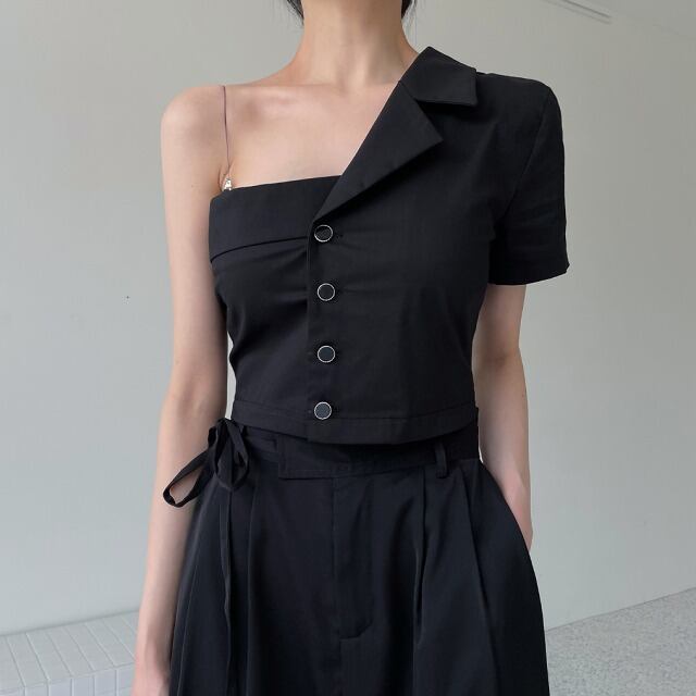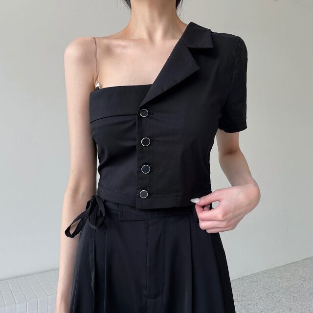 全2色 トップス アシンメトリー オフショルダー 切り替え スリム 着痩せ シンプル